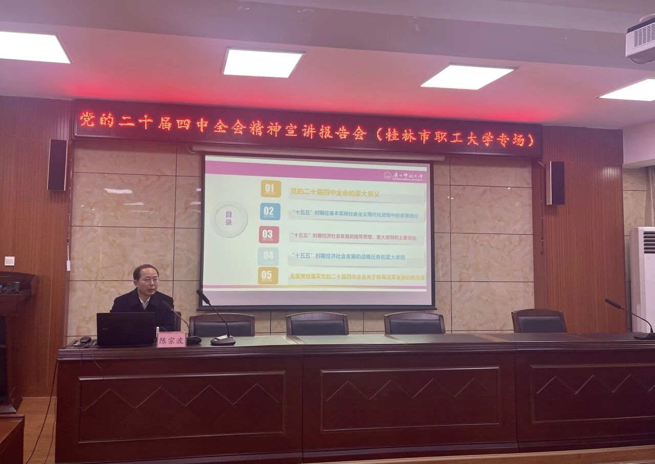 为深入学习贯彻党的二十届四中全会精神,引导全校教职工切实把思想和行动统一到党中央决策部署上来,12月26日,桂林市职工大学举办党的二十届四中全会精神专题宣讲报告会,报告会邀请广西师范大学图书馆馆长、自治区党委讲师团特聘教授陈宗波作专题辅导,学校全体教职工及党员干部参加学习。